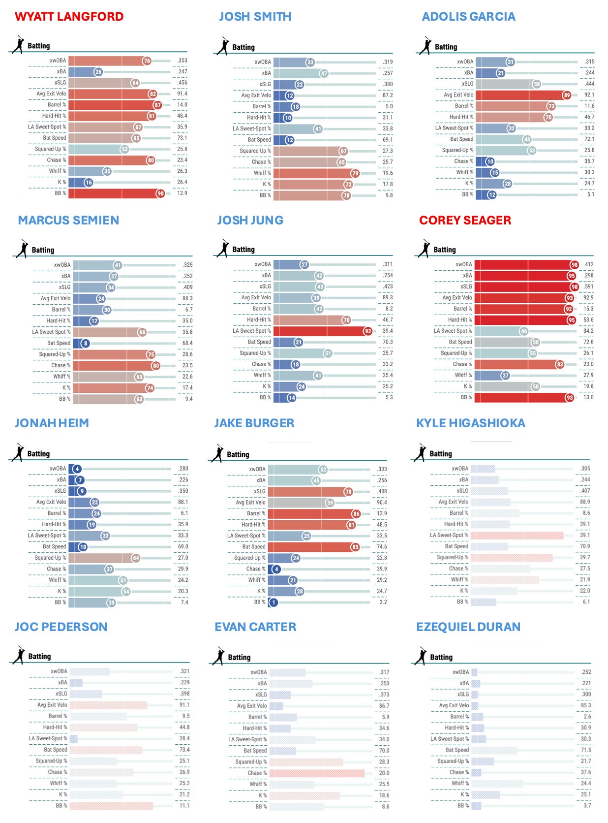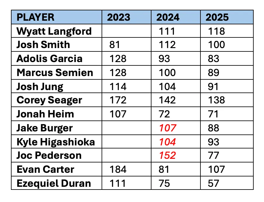 I haven't looked at SLG and OPS+ for the full 2025 season, but the numbers were down in '24 and were trending down for '25. Jung and Adolis need to change their game, IMO.