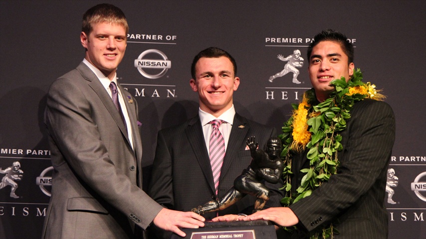 Collin Klein (left) at the 2012 Heisman Trophy ceremony with Johnny Manziel and Manti Te’o.